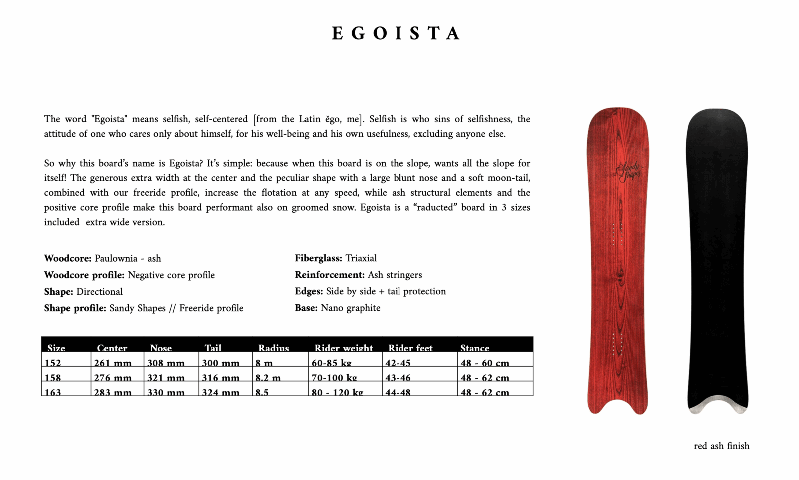 Ora Egoista viene prodotta in 3 misure tutte molto generose in larghezza in fatti la 158 cm è larga 27,6 cm e la 163 cm ben 28,3 cm adatte a chi ama tavole corte con superfici di galleggiamento in neve fresca molto grandi.